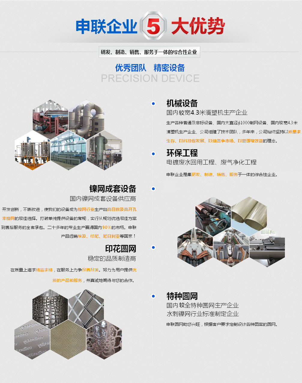 申联企业是一家集机械设备、环保工程、镍网生产成套设备、印染镍网、特种镍网等系列相关产品的研发、制造、销售、售后服务于一体的综合性企业。企业属下有宜兴申联机械制造有限公司和宜兴市申联环保纺织器材厂有限公司。